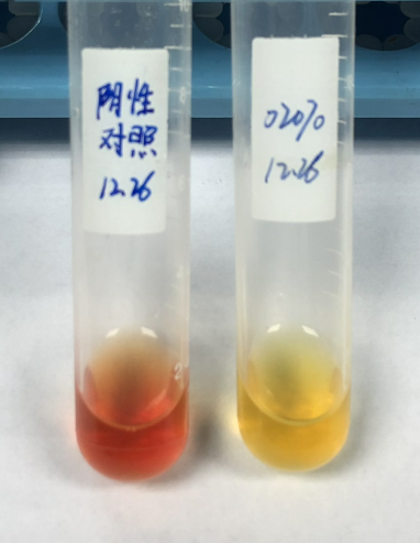 圖3 葡萄糖發(fā)酵實(shí)驗(yàn)培養(yǎng)基顏色變化。                                                          4 精氨酸培養(yǎng)基顏色變化。