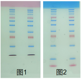 圖1國內(nèi)某知名廠家一步法PAGE凝膠預染Marker電泳圖,150V 45min.圖2 Starvio一步法PAGE凝膠預染Marker電泳圖,150V 35min。