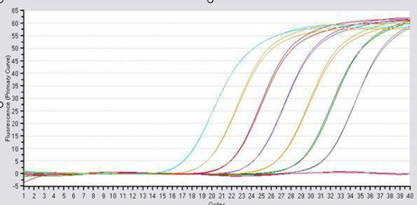 圖.1 用StarvioHC染料法熒光定量PCR試劑盒擴(kuò)增GAPDH基因的一個(gè)片段,5倍系列稀釋,每個(gè)反應(yīng)重復(fù)1次。可見,StarvioHC 具有較高的反應(yīng)靈敏度,重復(fù)性好,線性范圍寬。