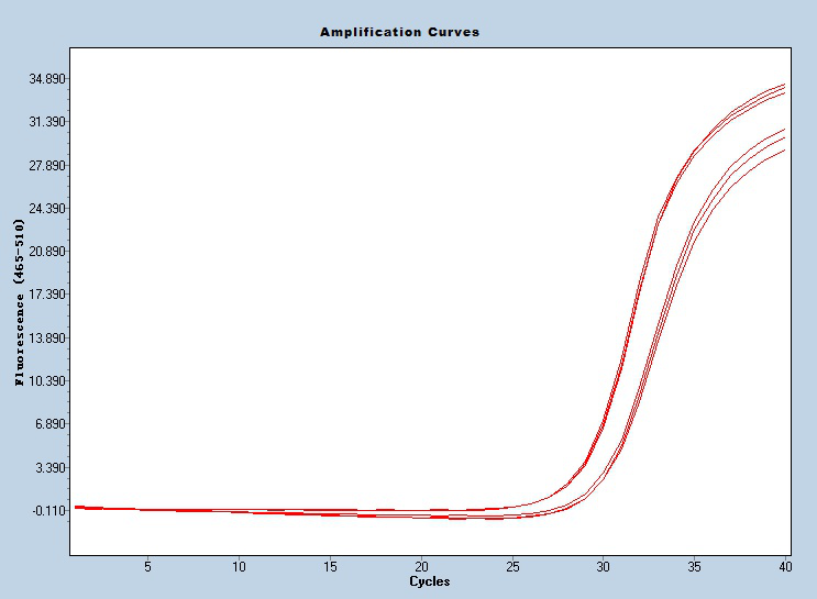 圖.2 用StarvioHC染料法熒光定量PCR試劑盒與國(guó)外著名供應(yīng)商T的sybr green Kit擴(kuò)增GAPDH基因一個(gè)片段的擴(kuò)增曲線,模板量一樣,每個(gè)反應(yīng)重復(fù)3次??梢?,StarvioHC 具有酶動(dòng)力強(qiáng),靈敏度高,CT值較早,擴(kuò)增曲線典型等優(yōu)勢(shì)。