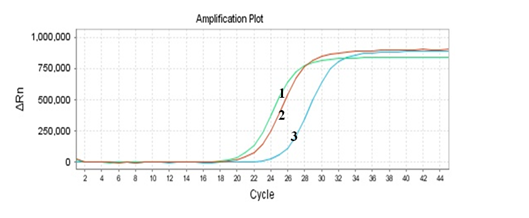 圖 使用Starvio多重探針?lè)晒舛縋CR試劑盒檢測(cè)泌尿生殖道支原體、衣原體感染。1為支原體擴(kuò)增曲線,2 為衣原體擴(kuò)增曲線,3 為內(nèi)參基因擴(kuò)增??梢?jiàn),Starvio多重探針?lè)晒舛縋CR試劑盒具有靈敏度高,擴(kuò)增曲線好,酶動(dòng)力強(qiáng)等憂點(diǎn),非常適合于多重基因檢測(cè)。