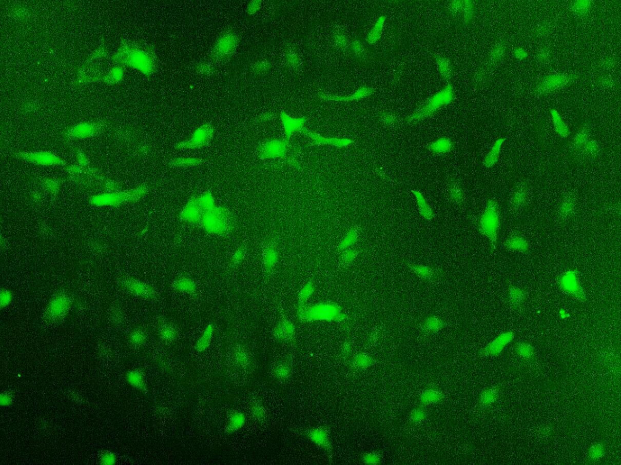 圖A. Starvio Huvec轉(zhuǎn)染GFP質(zhì)粒至Huvec細胞,24h,熒光圖。