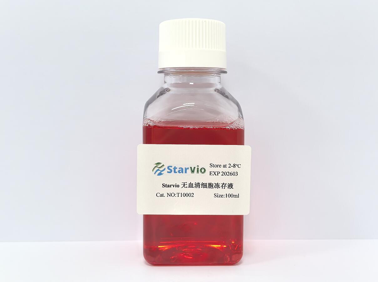 Starvio無血清細胞凍存液是星啟百代海歸團隊經過反復優(yōu)化后研發(fā)出的一款通用型無血清細胞凍存保護產品。本凍存液含有多種經過優(yōu)化篩選的細胞營養(yǎng)因子和冷凍保護物質,既可以保護細胞免受凍存過程中的冰晶、脫水等的損害,又可以在低溫環(huán)境下,為細胞提供足夠的營養(yǎng)支撐,使其不會發(fā)生凋亡和自噬等,從而大大提升了細胞復蘇后的存活率和細胞活力。Starvio無血清細胞凍存液配方成份明確、不含血清和蛋白,大大降低了細菌、病毒和支原體等的污染概率,使細胞能夠更加安全地長期保存,特別適合于對培養(yǎng)基成份有明確要求的蛋白表達工程類細胞(如CHO、293細胞等)和治療用細胞的冷凍保存。本產品為即用型細胞凍存液,使用簡單,不需要臨用時再行調配,不需要漫長的程序性降溫過程,可廣泛應用于絕大多數(shù)細胞和小塊組織的冷凍保存,包括貼壁細胞株、懸浮細胞株、原代細胞、類器官和組織小塊等。