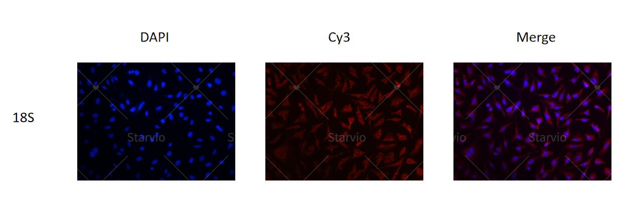 圖.使用Starvio Cy3標(biāo)記RNA探針合成試劑盒合成cy3-18S RNA,F(xiàn)ISH實驗檢測Hela細胞中18S rRNA的定位。