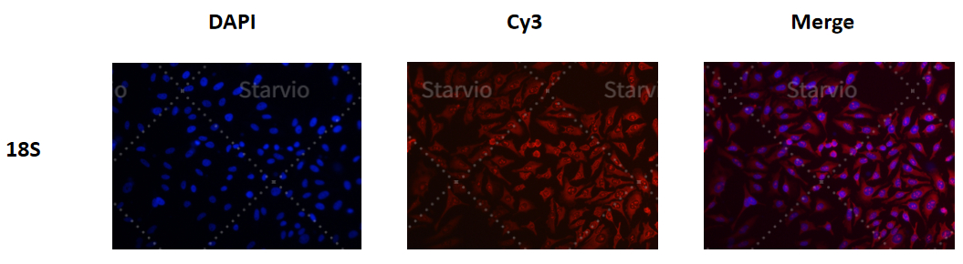 圖1. 使用Biotin-18S RNA探針和Cy3-Avidin,通過Starvio熒光原位雜交試劑盒II進行FISH實驗檢測Hela細胞中18S rRNA的定位。